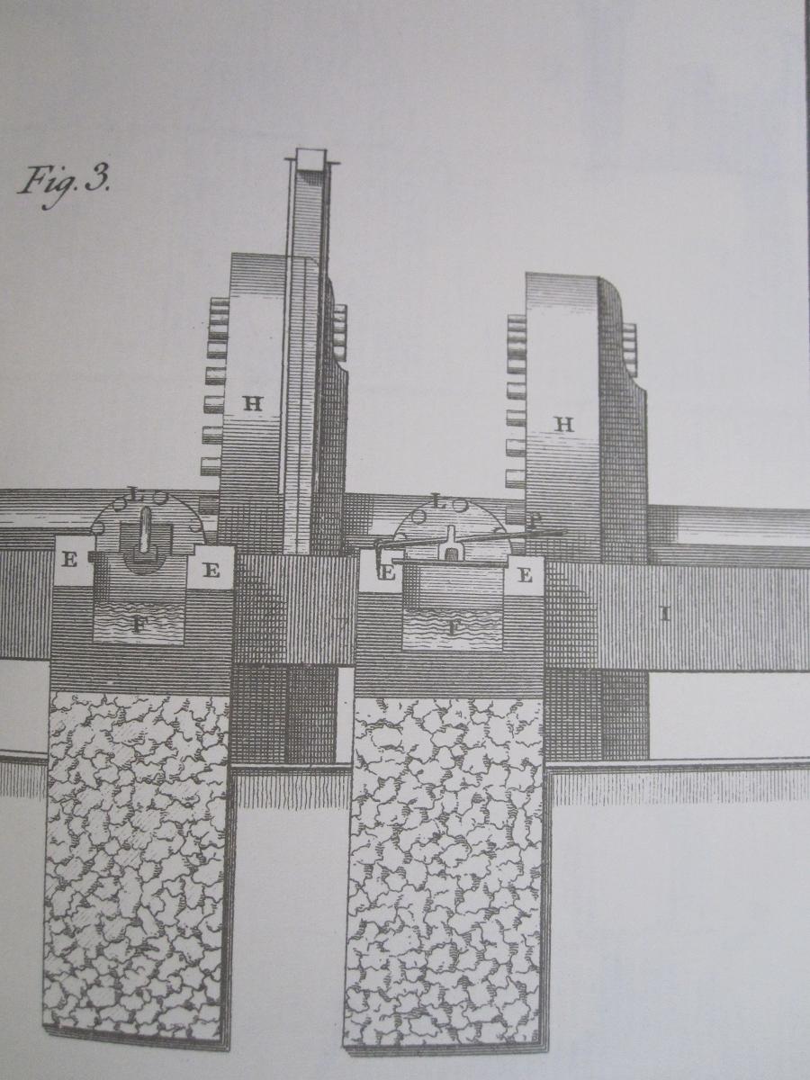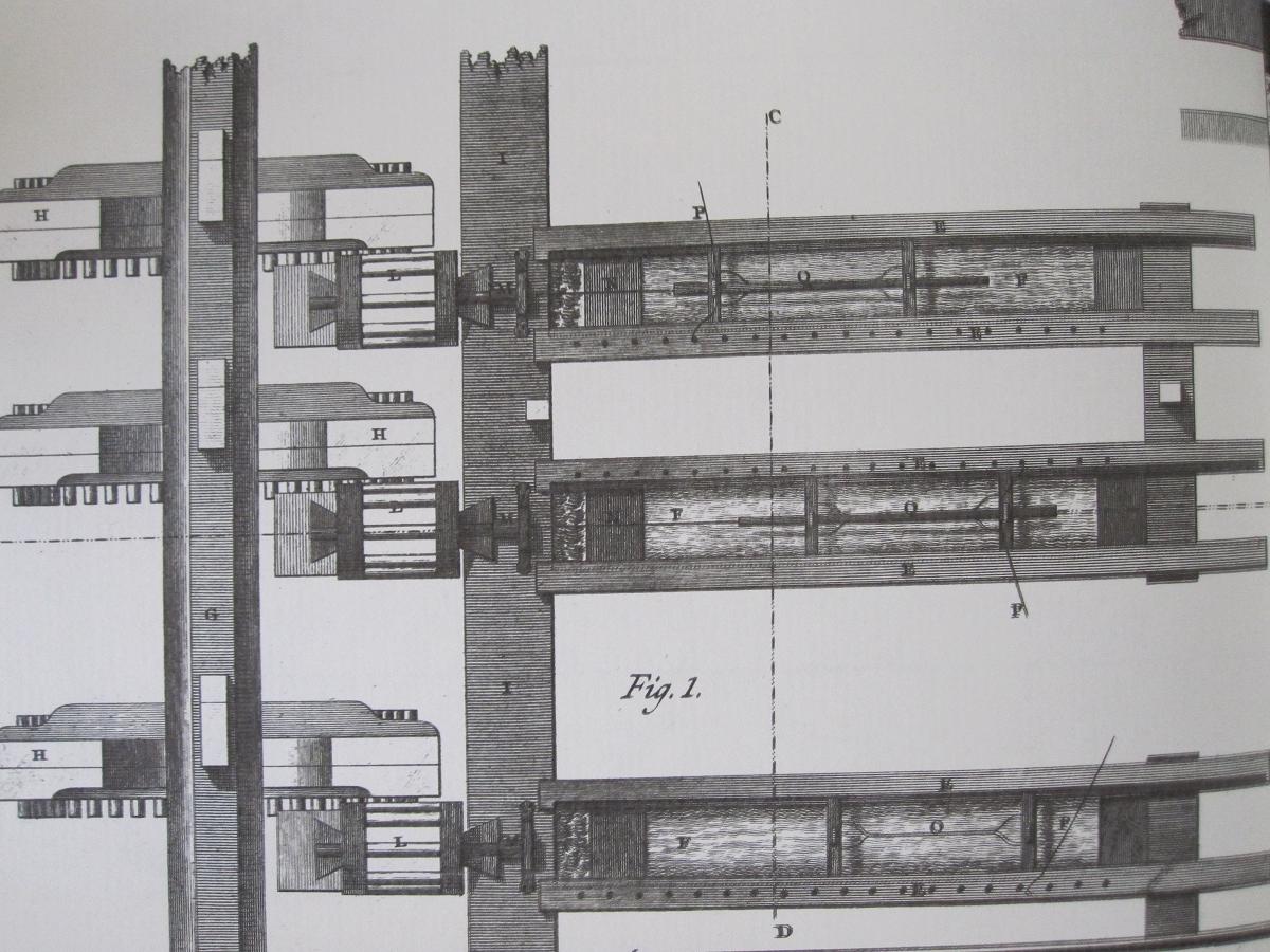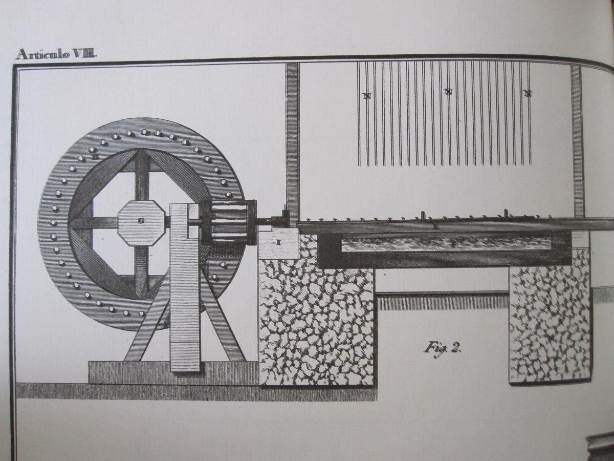 Una corriente de agua servía para hacer girar el eje G. Con el eje giraban la ruedas dentadas H, que a su vez hacían girar las linternas L. A la prolongación del eje de cada linterna se unen las barrenas. En el bastidor E, un dispositivo de corredera O P permite avanzar o retroceder al cañón respecto a la barrena. Justo debajo, una artesa F contiene agua para enfriar el cañón, que se calienta mucho al ser barrenado, y para alojar las virutas. En Fig. 2 podemos ver como encima cuelgan las diferentes barrenas a utilizar progresivamente N.