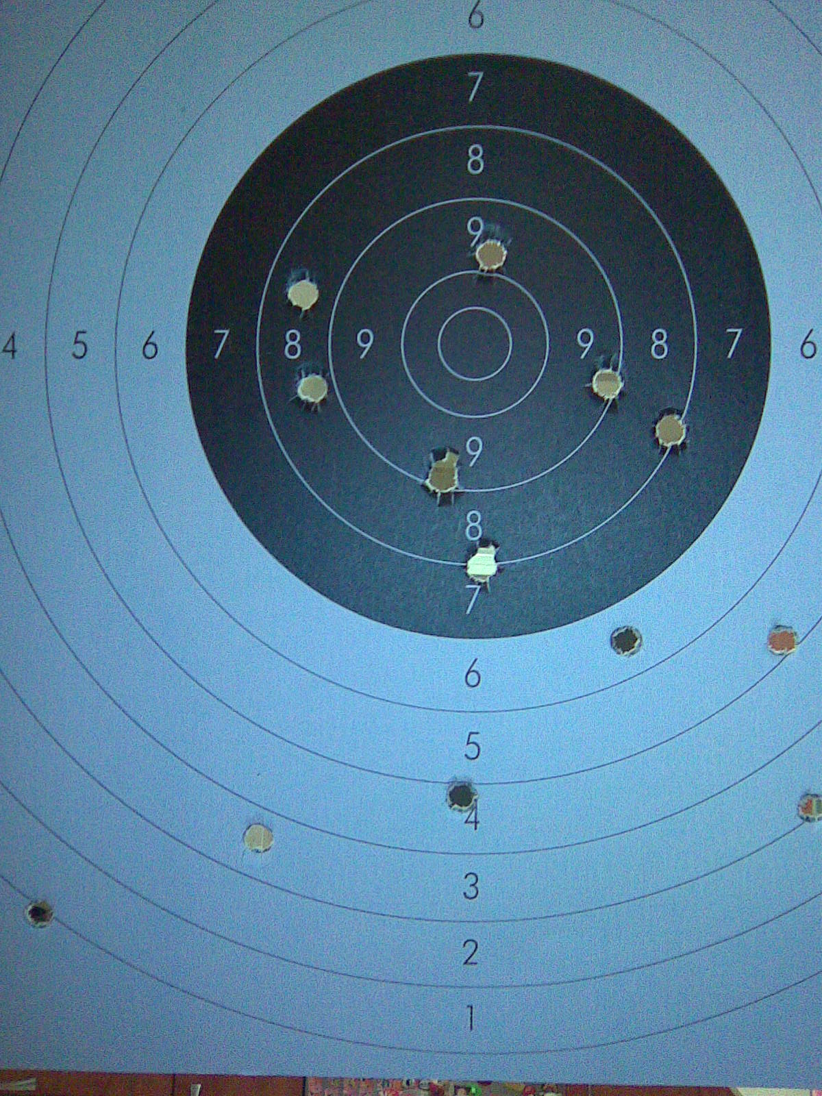 Mi primer disparo alto; corrijo el alza y como podeis ver en la imagen no ha ido del todo mal, a excepción de otro alto que no acabo de comprender; lo achaco un poco tambien a lo incomodo de la situación; supongo que aprenderé a desconectar del ambiente general.