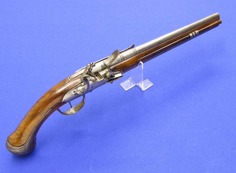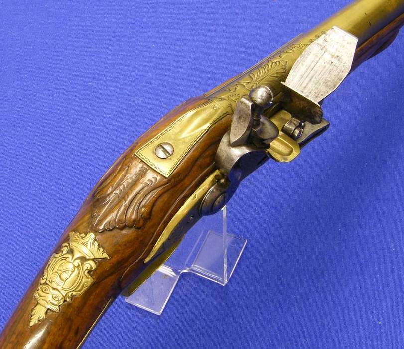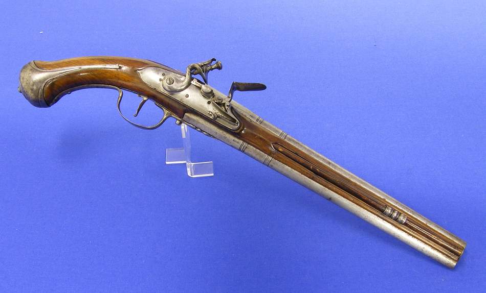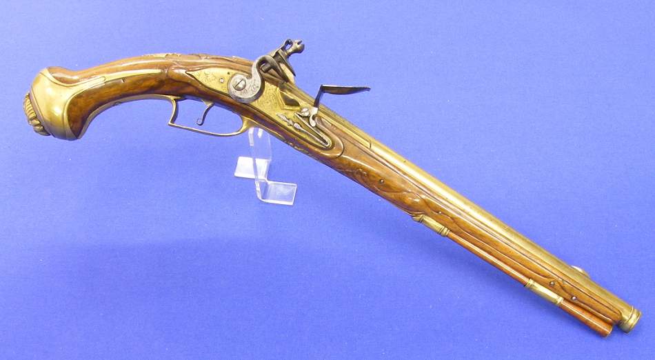 No es muy elocuente el vendedor con la descripcion de esta pistola de doble cañon del siglo XVII, de 51 cm de longitud y muy bien conservada. A mi me parece centroeuropea (Alemania, Belgica, Holanda, Chequia ... de por ahi) Lo que mas me llamo la atencion es su sistema de disparo, tiene dos cañones pero solo un pie y un rastrillo.