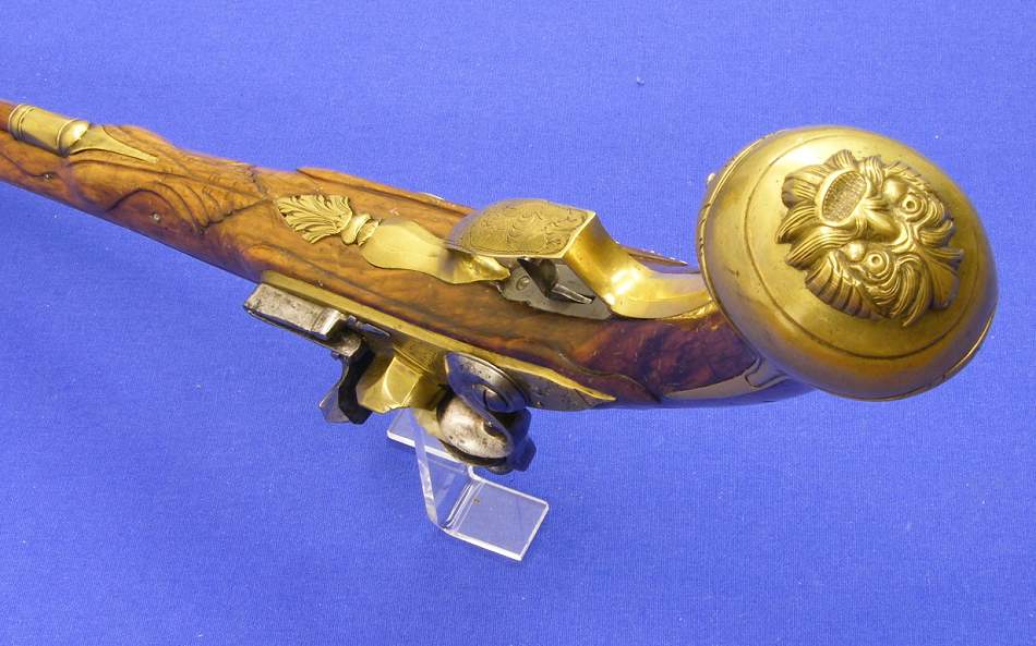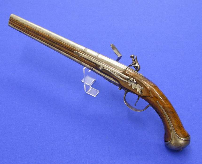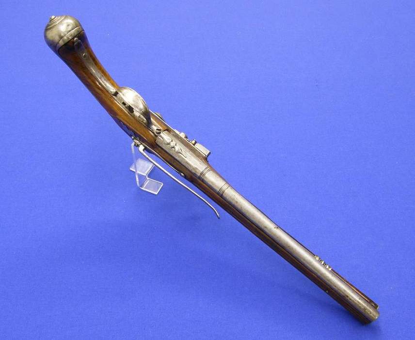 Una bella pistola alemana de silex, sobre 1720, con cañon de hierro enfundado en un tubo de bronce con la marca de Essen (espada), calibre 15 mm, longitud de 51 cm en muy buen estado.