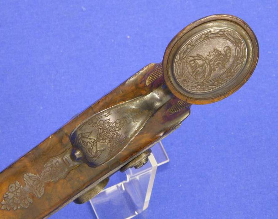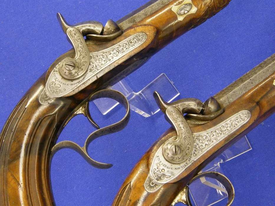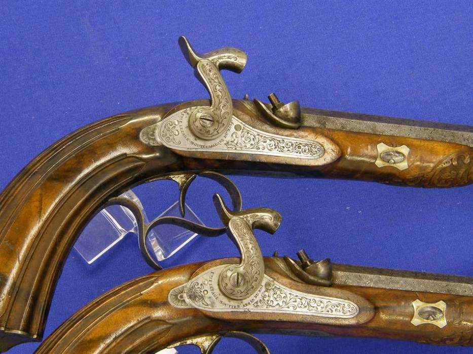Un bonito estuche con una no menos bonita pareja de pistolas de percusion francesas por Le Page-Moutier, Arqubusier du Roi en Paris, en impecable estado. Las pistolas tienen los cañones en fino damasco con un calibre de 13 mm. La longitud de las pistolas es de 37 cm.