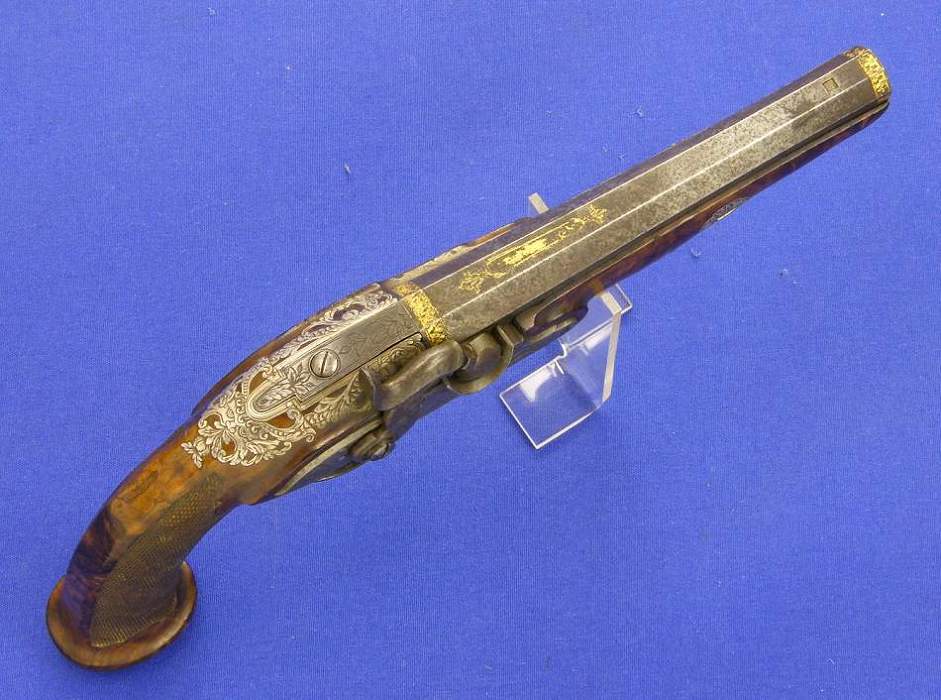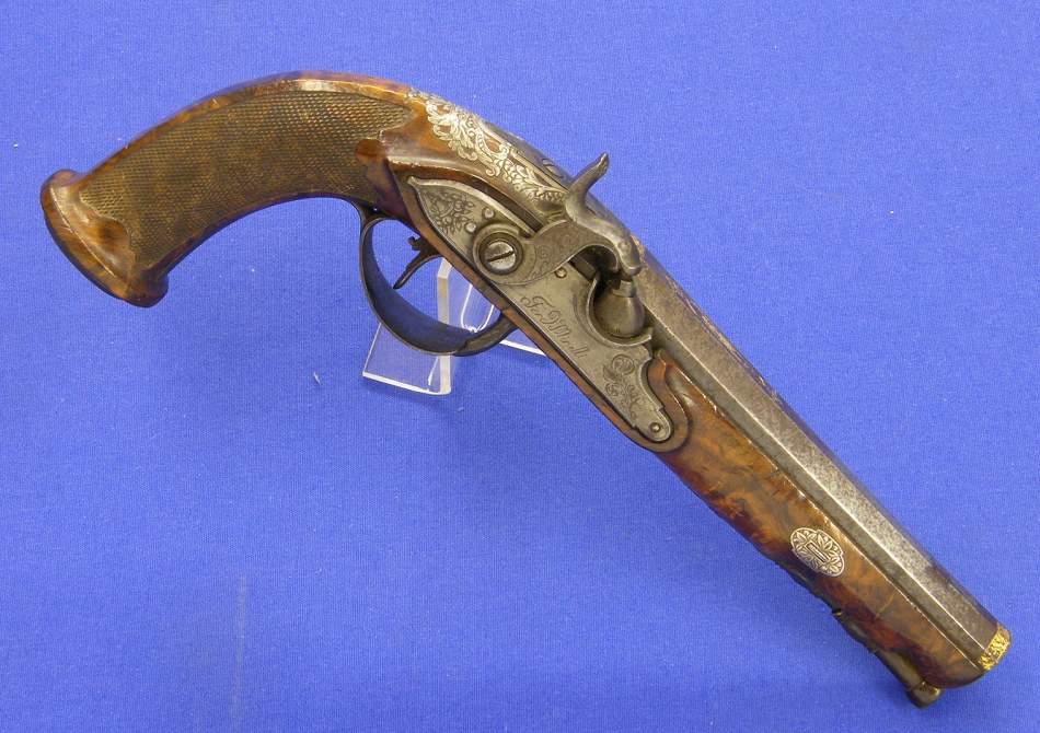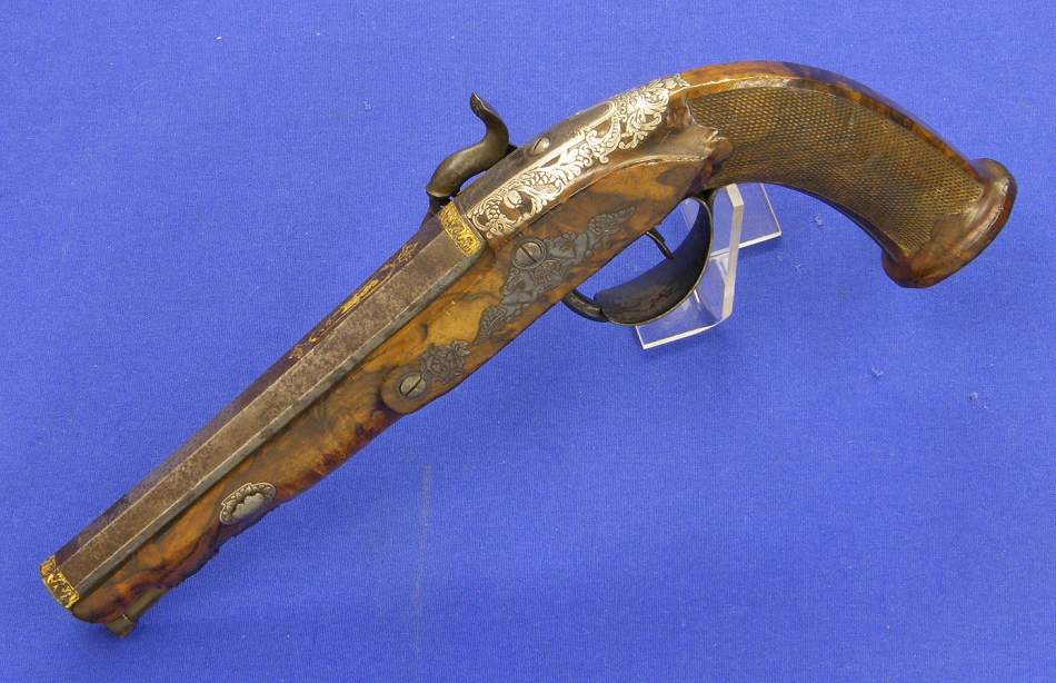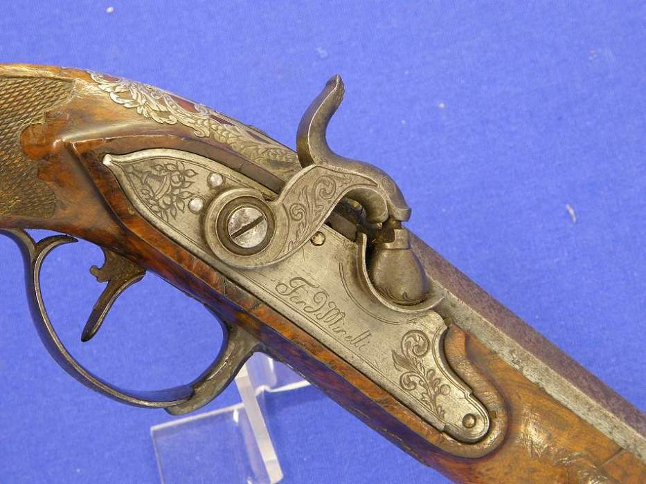 A very attractive Italian perkussion pistol with silver inlays and gold decorations, burr walnut stock, signed lock Ferd. Minelli, barrel Brescia, length 31 cm, in mint condition