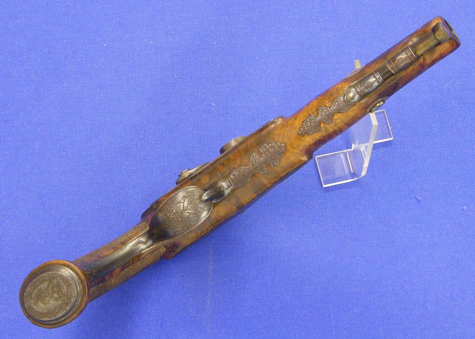 The pistols have fine damast barrels, caliber 13 mm. Length of the pistols 37 cm.