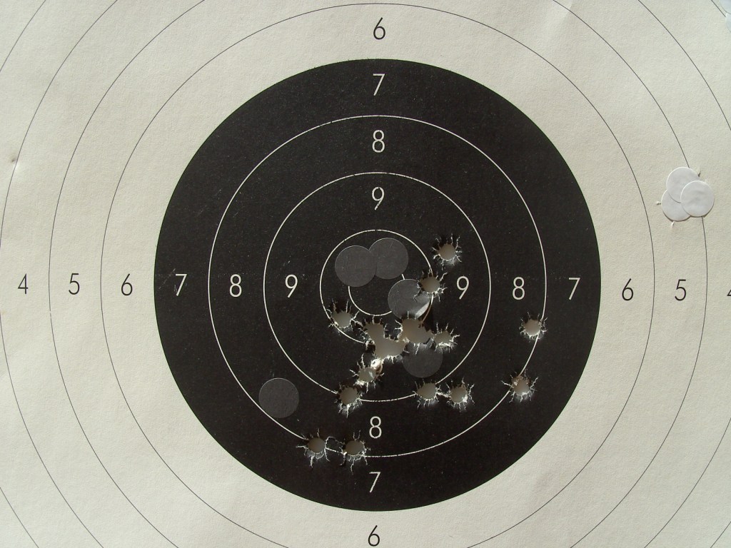 El primer disparo, como es habitual en minié se ha ido a un sitio distinto al resto (es el impacto de la izquierda)