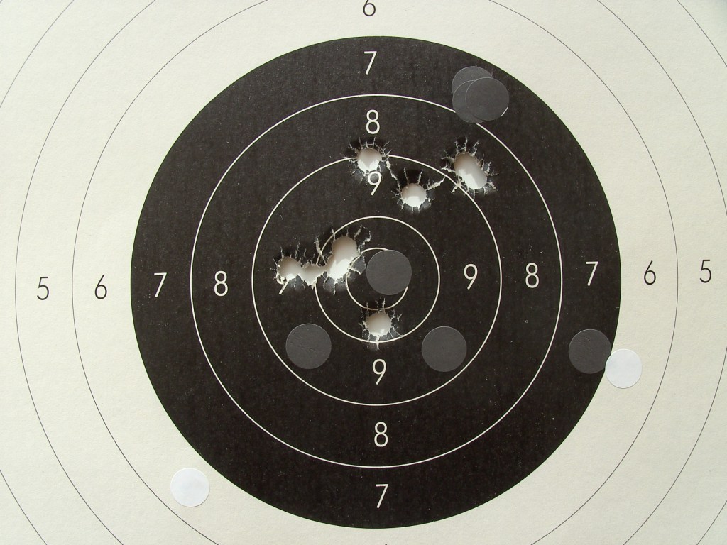 Paso a la carga con Suiza del 2 (45 grains) y el resultado no es bueno (son los impactos en la diagonal a las dos fuera del negro)