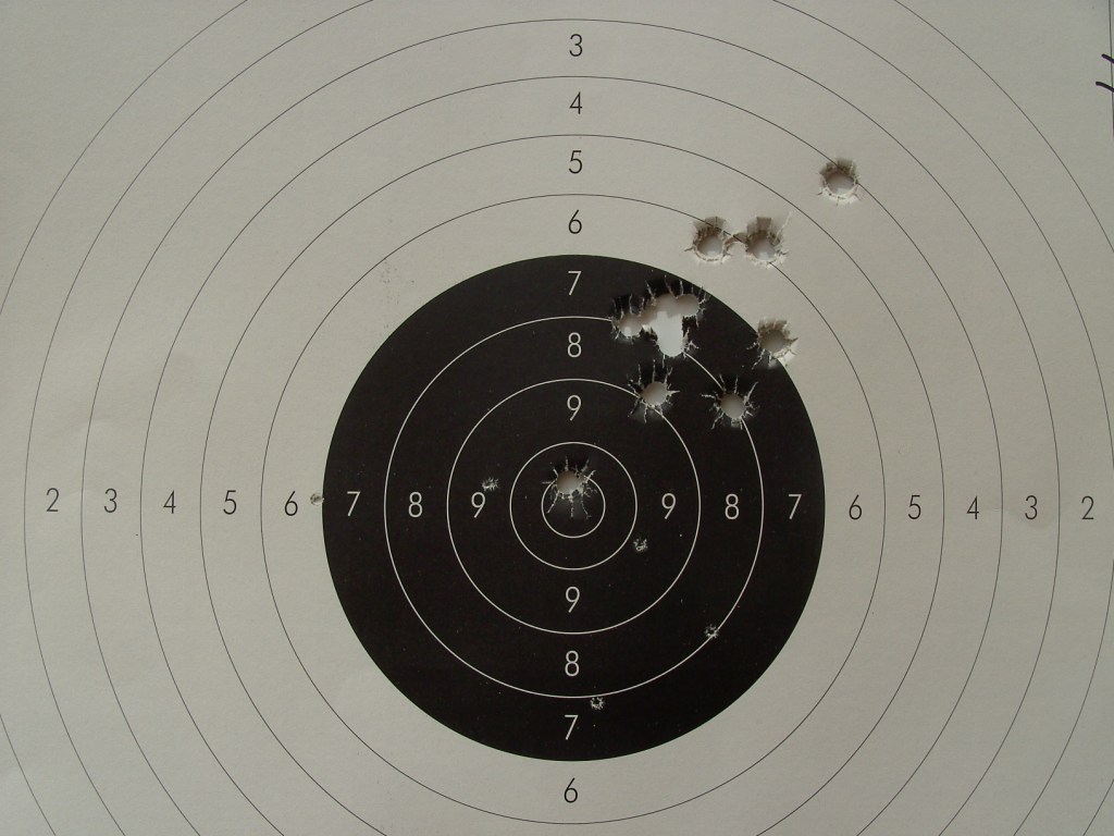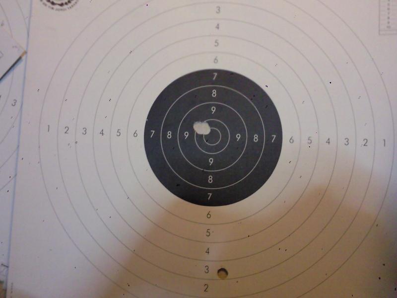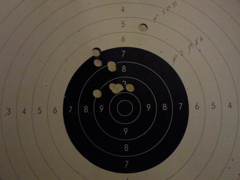 Prácticamente idéntica agrupación pero ligeramente mas alta, la carga era un pedo de mosca pero agrupar agrupa, para lesionarme el hombro debería de tirar unos 2000 tiros o mas parecía un .22.