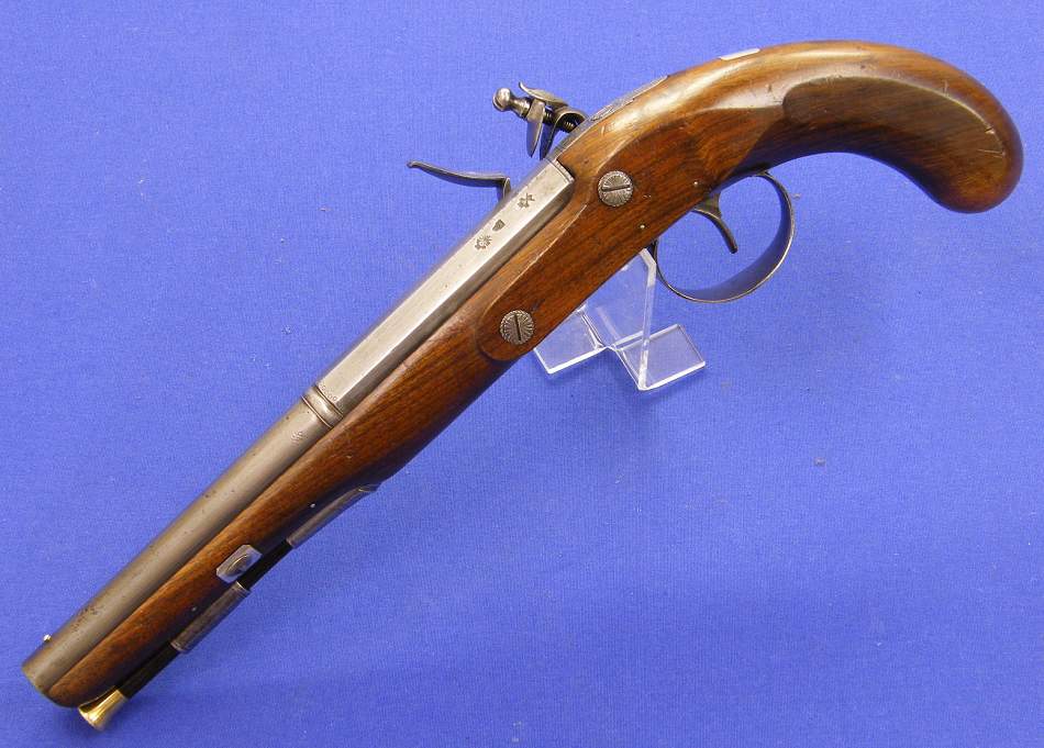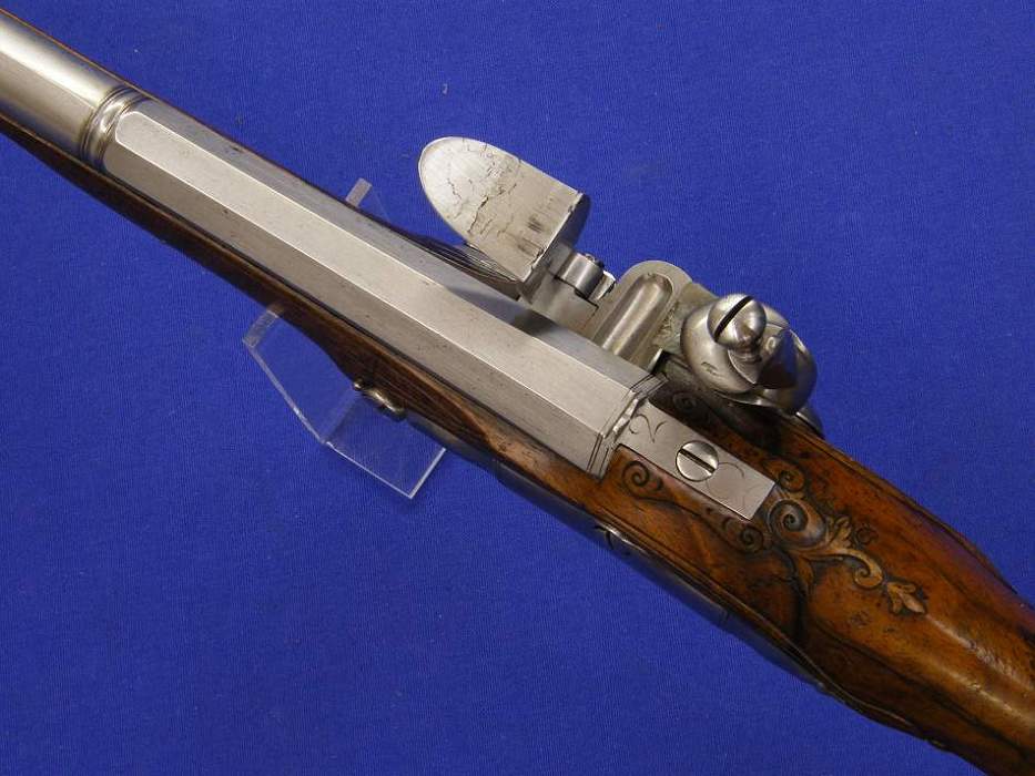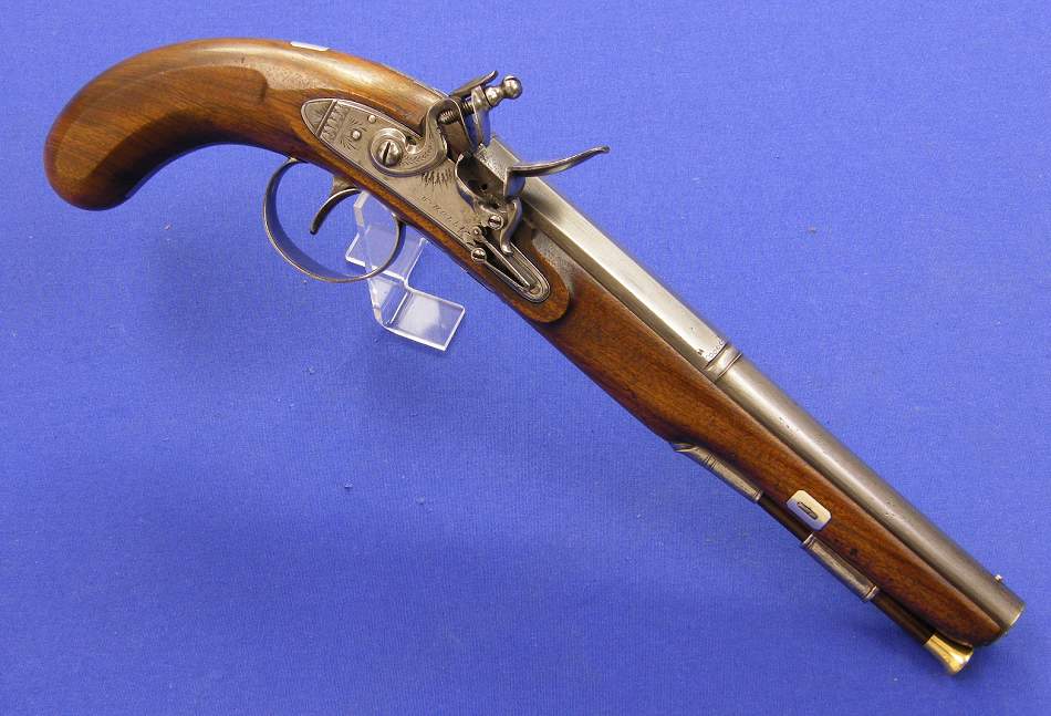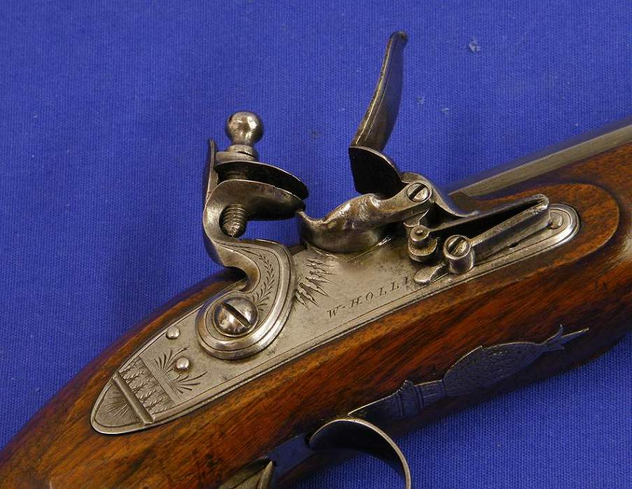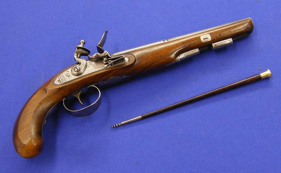 Preciosa pistola inglesa de silex por W. Hollis de Birmingham sobre el año 1800, calibre 17 mm, longitud 39 cm. En perfecto estado.