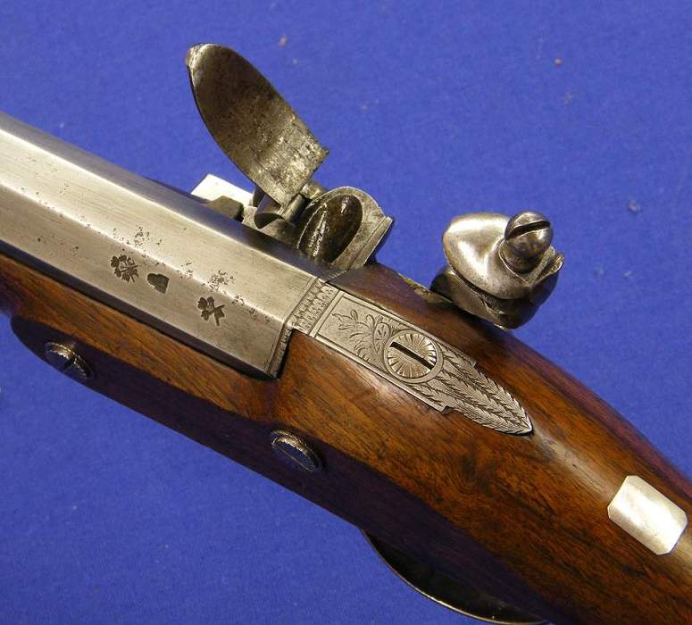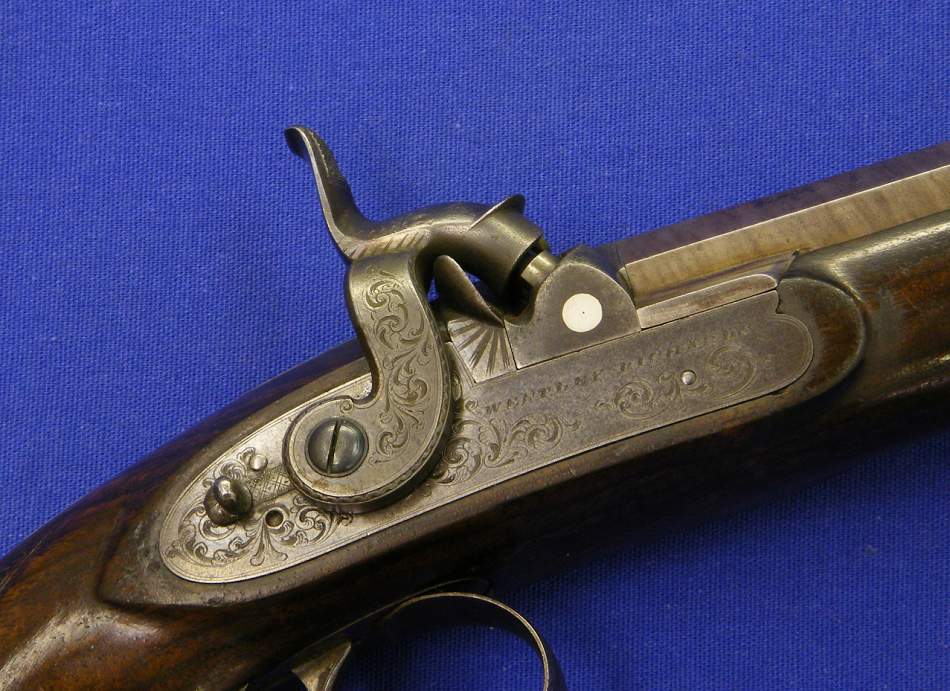 A very nice English percussion pistol by WESTLEY RICHARS, 170 New Bondstreet London, caliber 14 mm, length 26 cm, in mint condition