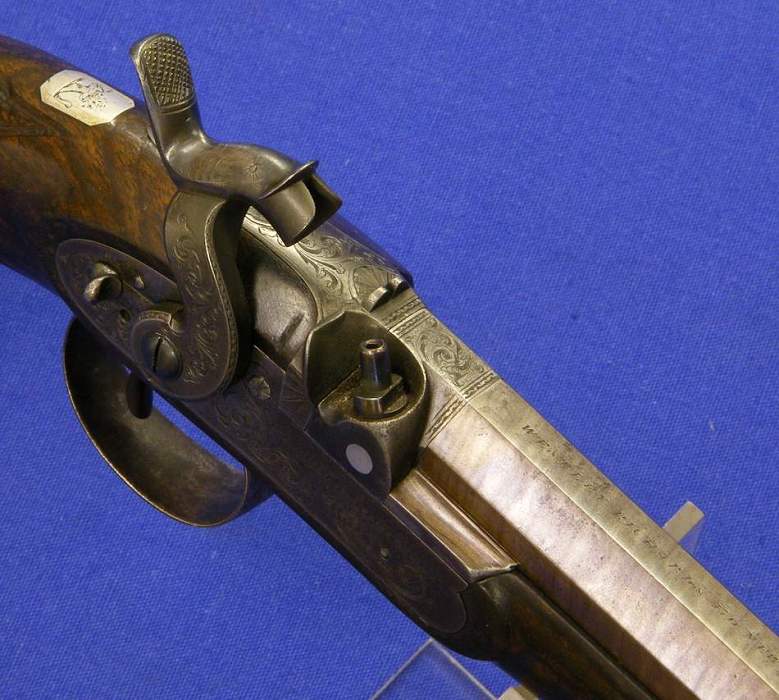 Un preciosa pistola inglesa de percusion por Westley Richars, en el 170 de New Bondstreet Londres, calibre 14 mm. Longitud 26 cm. En perfecto estado.