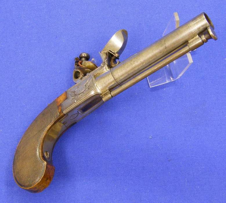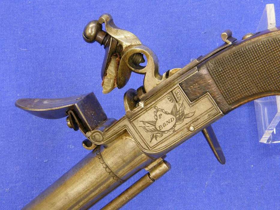 Una bella y de alta calidad pistola de silex inglesa de bolsillo fabricada por P. Bond de Londres, sobre el año 1800, calibre 13 mm. Longitud 22,5 cm. En perfecto estado,