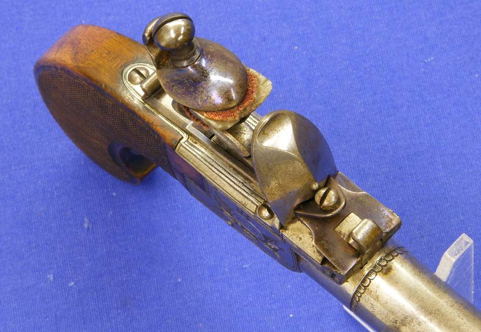 A very nice high quality English Flintlock Pocket Pistol by P. BOND LONDON, circa 1800, caliber 13 mm, length 22.5 cm, in mint condition