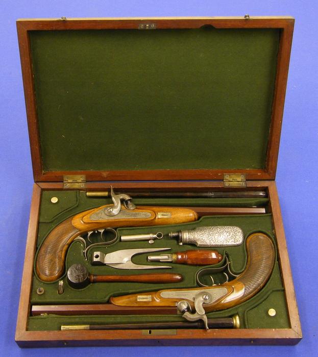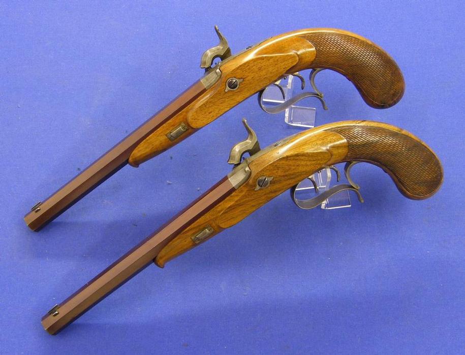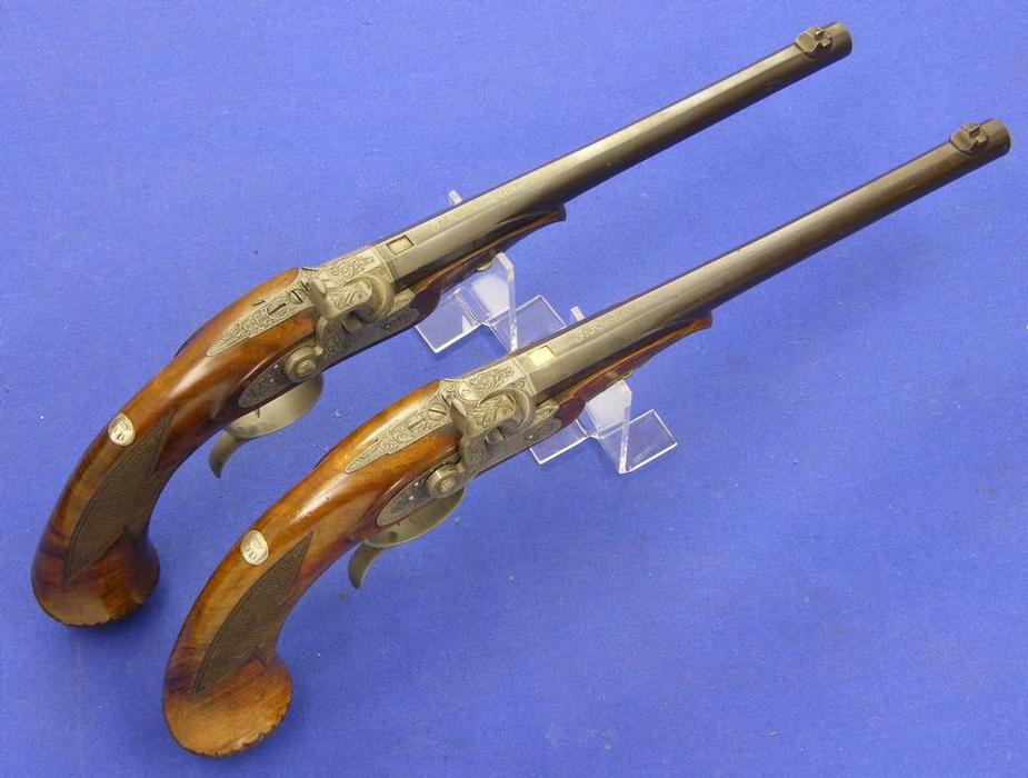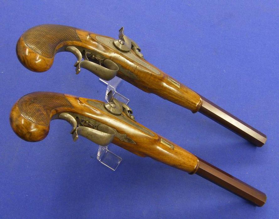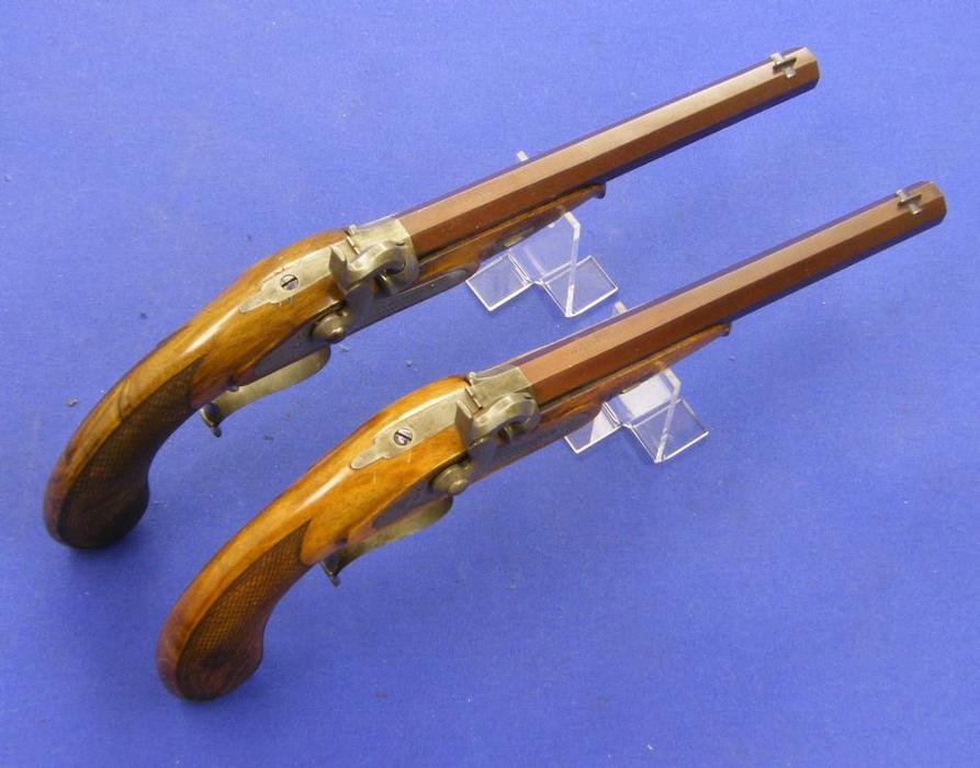 The pistols have set-triggers. Barrels original brown. Iron parts original grey.
