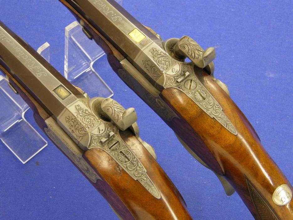 Precioso y caprichoso estuche de un soberbio par de pistolas de percusion por J.G.Haugaard in Kjobenhavn, en caslibre 12 mm y 40 cm. de largo. Estado de excepcion