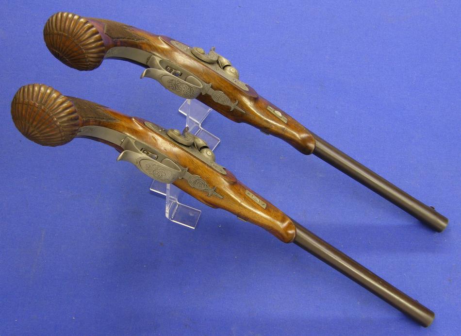 Una preciosa pareja de pistolas de pedernal de origen checo por el Sr. Georg Antonius Feiler de Carlsbad hacia el año de 1.700, en calibre 15 mm (bastante gordo) y un largo de 53 cm.
