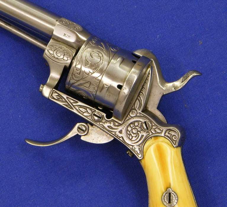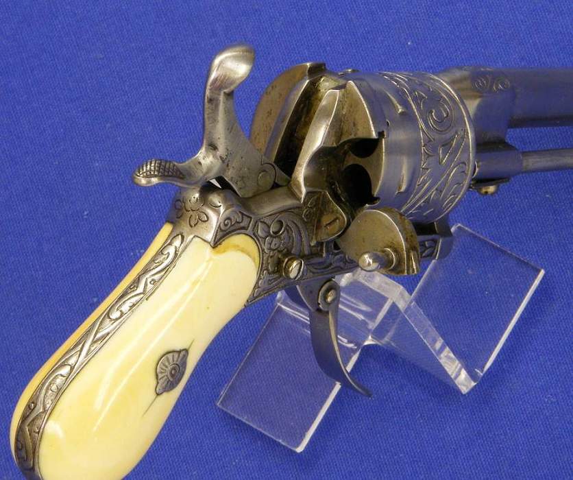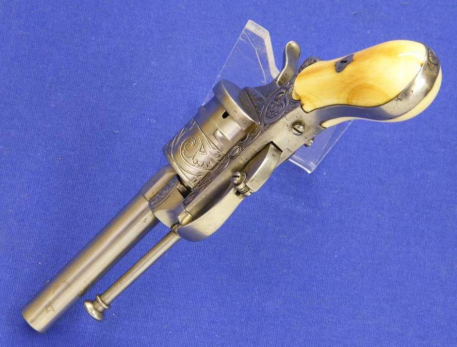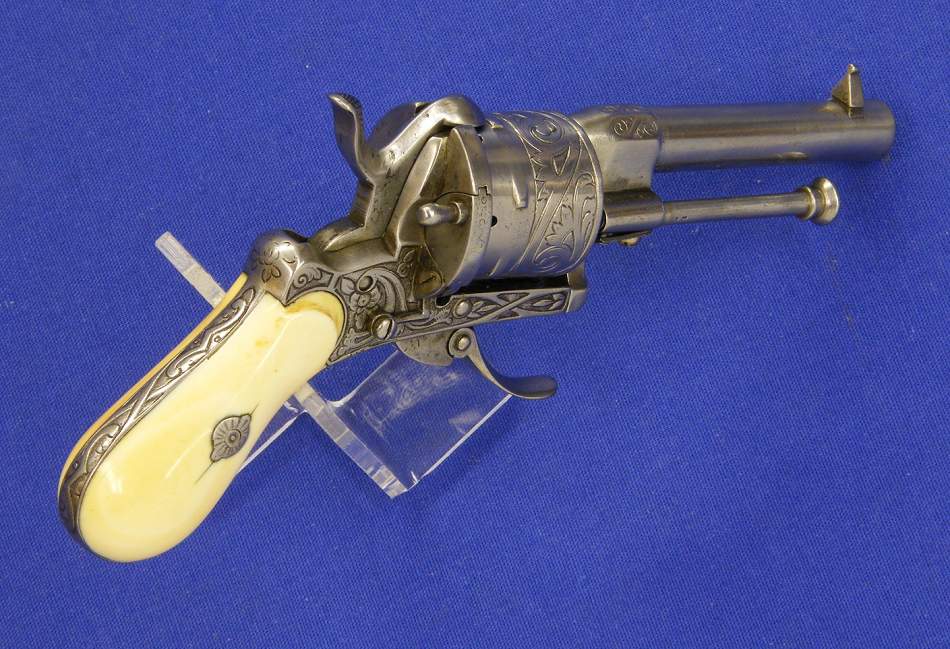 A very nice engraved Liege Pinfire Revolver with Ivory grips, signed NJH, 6 shot, caliber 7 mm, length 17 cm, in very good condition. Price 550 euro