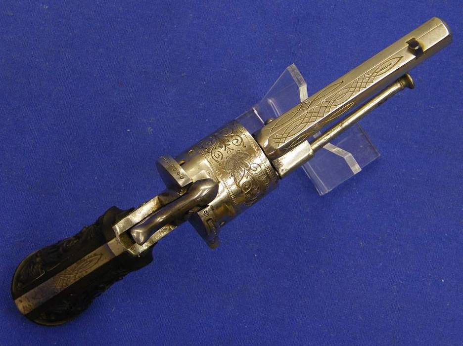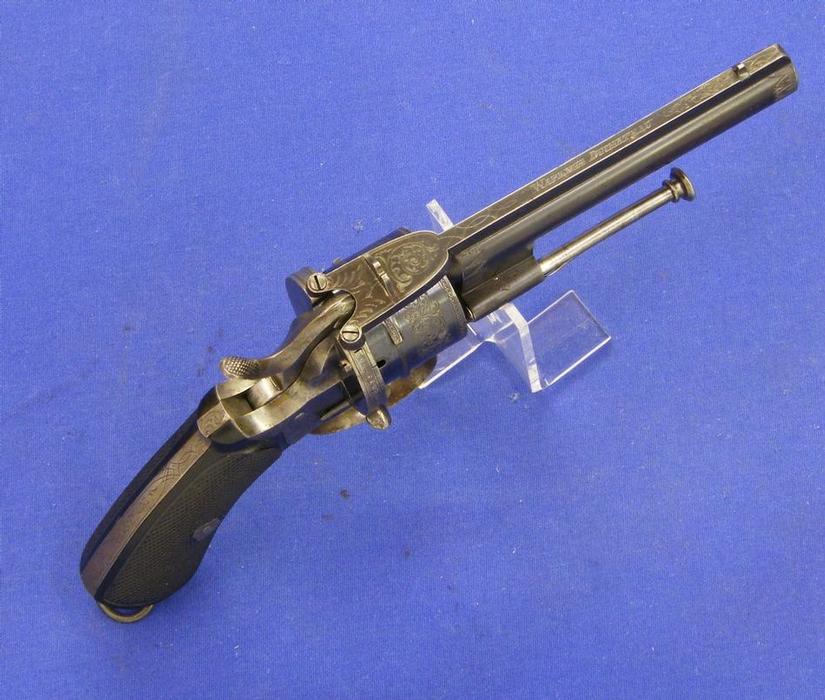 A very nice and scarce Dutch "Maastricht"pinfire revolver WAPENH.l DUCHATEAU, caliber 9 mm, length 26 cm, in mint condition. Price 1.500 euro