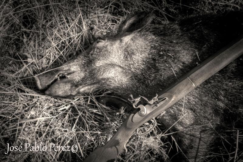 Despues de estar metido en el monte desde las 5 de la tarde, fue ya entre dos luces cuando empezaron a acercarse, el macho se quedo donde siempre, a la espectativa, tenian el viento malo y junto a el me entraron dos piaras, con las crias creciditas, yo a 10 m. en el suelo de rodillas viendoles, al de un rato decido levantar el rifle, apuntar y..............chisss...pummmmm, quejido de la bicha, pegada de columna y removiendose en el suelo............¡ QUE GRAN MOMENTO !, para no alargar el sufrimiento , le entro a cuchillo, no sin pocas precauciones, me tiraba cada tarascada de la leche.Bueno, ahora toca atarlo, bajarlo del monte y a colgarlo en la cuadra, que mañana toca tarea.