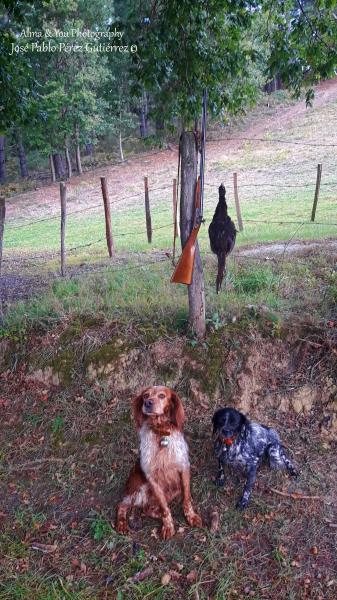 La zona era como siempre unas empinadas laderas, los perros marcando, pero como peonan las jodidas. A lo largo de la mañana se dieron cuatro lances y ....¡Dios mio!, lo que nunca, ocho tiros a perdiz y faisan y ni tocar pluma.Entretenido si, pero se acercaba la hora de marchar y con los perros que lo dieron todo, decidi ir ya para el coche, no sin antes pasar por la poza para que se refrescasen. Ya con los pistones retirados de la escopeta y relajado, vi como los compañeros disfrutaban del agua y fue entonces cuando el fiera desde dentro muestró....¡joder!, que va a tener pajaro...salio muestreando y parando en el jaral a escasos metros del agua y pense, sea lo que sea, no marcha y al de un tiempo, alli que sale...pim, pam y a criar, no me lo puedo creer, menos mal que entre los pinos y con suerte vi como a unos trescientos metros se hecho el pajaro, asi que en ese momento retuve a los perros y cargue el arma, perooooooooooooo, esta vez sin taco de fieltro, los perdigones directamente encima de la polvora y tapeta fina.Asi con todo vamos a por el pajaro, evidentemente no estaba donde se hecho, pero si unos cincuenta metros mas adelante, al otro lado del camino y en un jaral, marcaron los perros, fueron entrando poco a poco y alli que sale..............PUM, esta vez si, si que si, cobraron la pieza , disfrutamos los tres y luego unas fotuquis,Un buen dia.Saludos.