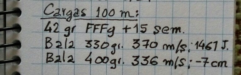Las cargas que me funcionan a 100 metros son esas de la fotografía, la segunda, impacta 7 cms por debajo de la primera a 100 metros.