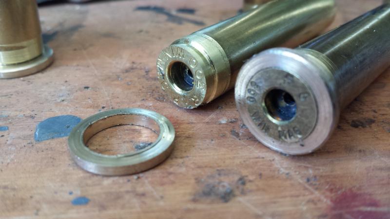 con el anillo puesto, simula la pestaña rinfire para apoyar la vaina en la recamara y el extractor, el grueso queda igual que en una vaina original.