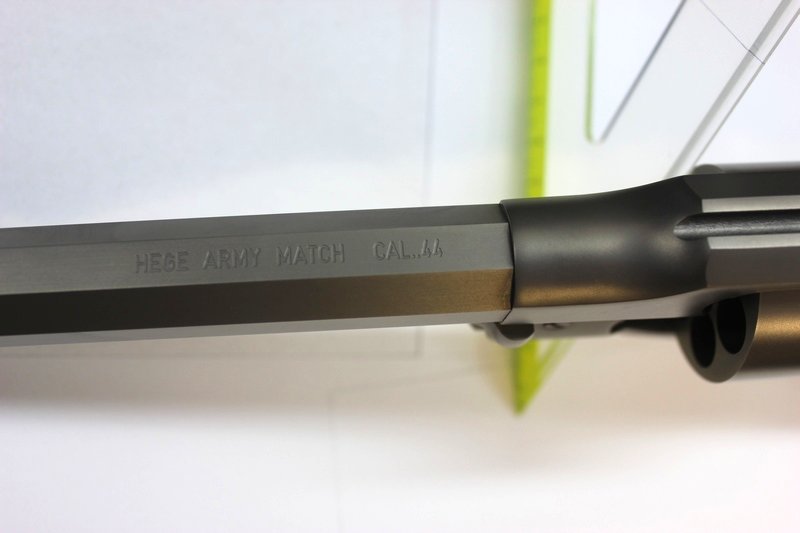 Hege army match, excelente copia del Remington 1858, fabricada por Feinwerkbau, cañón krupp martilleado en frío, comercializado por Hege en la Zeughaus de Uberlingen, junto al lago Constanza.