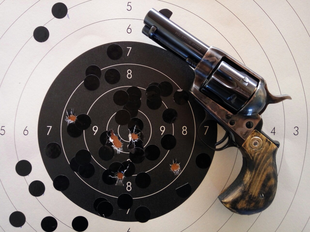 Mejor que el Cattleman, pende del Cattleman..., tengo uno con cañonde 3,5" que agrupa mejor que cualquier otro revolver de la configuración que sea que haya caído en mis manos, suelo tirar con el un tambor de vez en cuando solo para alegrarme el día, os pongo algunos blancos, ni yo me explico porque agrupa mejor que otros de 5,5" que tengo