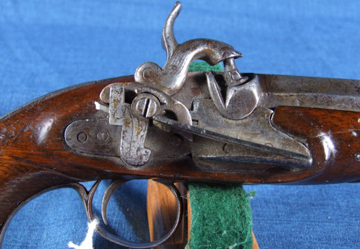 Early Spanish Migulet Pistol, engraved and worn overall, with wear to metal and checkered grip. Functional, some oil has been added to the wood at some modern time. Very good overall. Some repaired stress lines, glued, with only line visible. Well done repairs.