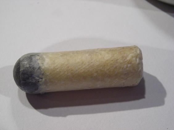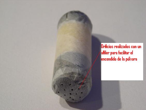 Lo que más me preocupaba es la parte del cartucho que da con la chimenea, quería que el contacto por esta parte fuese lo más directo posible. De hecho solo está en contacto una capa de papel sin ninguna doblez para evitar un fallo de encendido de la pólvora. Ya sé que vosotros habéis tirado con cartuchos con dobleces por los dos extremos y os ha ido bien, por lo que he leído en el foro, pero como me gusta hacer cosas nuevas y que queden a mi gusto, pues lo he hecho así. En la foto el cartucho esta relleno solo de sémola pero la idea es colocar entre la pólvora y el proyectil dos tacos de fieltro el más próximo a la pólvora sin engrasar y entre medias un trozo de papel aluminio para evitar que la grasa impregne el primer taco. Estos irán pegados con pegamento para papel, de barra, de los que utilizan los niños en el colegio. También he pensado hacer unos pequeños orificios con un alfiler en la parte del cartucho que está en contacto con la chimenea son lo suficientemente pequeños para evitar que la pólvora se salga por ellos y me imagino que facilitará el trabajo al fulminante. El único inconveniente que le veo es que te tiras por lo menos dos minutos en hacer cada cartucho.
