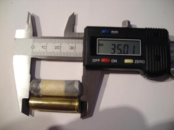 Estas son las medidas idóneas para el remigton NMA 44. Para testear rápidamente los cartuchos he utilizado una vaina del 357 magnum, pero valdría cualquier cosa que tenga 35mm. Con esta medida la bola queda enrasada en la recámara .