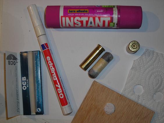 Estos son los materiales que he utilizado para la construcción de los cartuchos. El rotulador lo uso para darle forma al papel y para compactar la pólvora y la sémola. Con la vaina del 45 corto trocitos de papel para separar los componentes del cartucho.