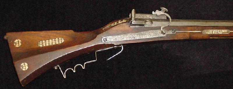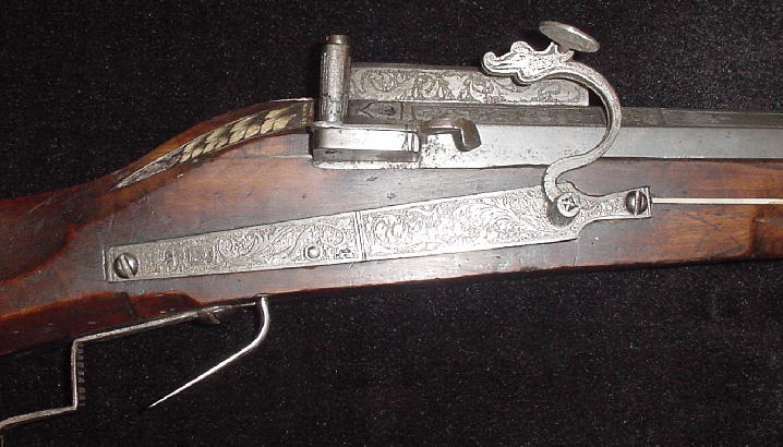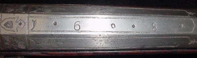 Muy pesado 50 5 / 8 "barril octogonal largo de aprox.. Calibre 75, 1 3 / 4" de ancho en la recámara. De nalgas grabado con un diseño floral y sellado con dos marcas de Suhl (Stockel # 1694 and1672, tanto dentro de un escudo) y la marca de un fabricante cree que es el de Valentín Klett. Klett fue miembro de la Asociación de Gunmaker Suhl y se trasladó a Zurich en 1603, donde se instaló con su hijo, también Valentín. El suministrado fusiles a la Zeughauser (arsenales) de Berna, Zurich y Basilea en Suiza, aunque la calidad de este fusil es mucho mejor que una pieza de arsenal y fue sin duda hecho para un hombre de la riqueza e importancia. La tapa plana del barril está grabada con la fecha "1608" en la recámara y también un alza encapuchados, grabado con follaje, y de la vista hoja de ataque. Lockplate grabado con un diseño floral y una cresta no identificados o el fabricante de la marca. Serpentine con grabado cabeza de monstruo, grabado pivotante sartén cubierta y el flash de la Guardia (daños leves). frutal stock completo provisto de asas para el resto de fusil, con incrustaciones de placas de hueso tallado (pequeñas reparaciones y restauraciones). Sustituido punta de cuerno de baqueta de madera. Longitud total 65 ", el peso 15 1 / 2 libras. Una calidad muy buena fusil fecha en muy buenas condiciones con restauraciones de menor importancia. Ciertamente, uno de los mejores fusiles de mecha europea en el mercado hoy en día.