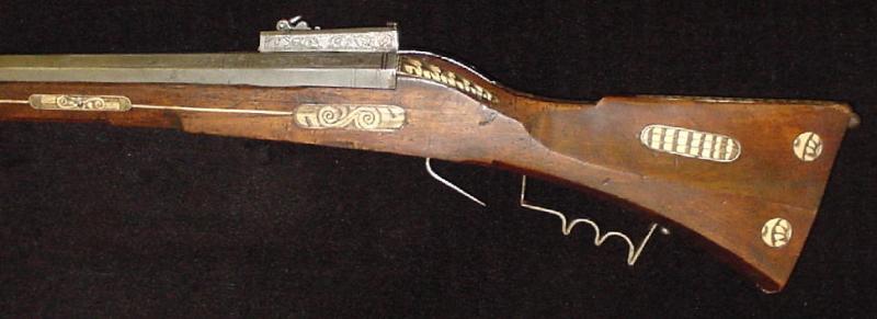 Very heavy 50 5/8" long octagonal barrel of approx. .75 caliber, 1 3/4" wide at the breech. Breech etched with floral design and stamped with two Suhl marks (Stockel #1694 and1672, both inside a shield) and a maker’s mark believed to be that of Valentin Klett. Klett was a member of the Suhl Gunmaker’s Guild and moved to Zurich in 1603, where he set up shop with his son, also Valentin. He supplied muskets to the Zeughauser (arsenals) of Bern, Zurich, and Basel in Switzerland, though the quality of this musket is far better than an arsenal piece and was surely made for a man of wealth and importance. The top flat of the barrel is etched with the date “1608" at the breech and also features a hooded rear sight, etched with foliage, and front blade sight. Lockplate etched with floral design and an unidentified crest or maker’s mark. Serpentine with etched monster head, etched pivoting pan cover and flash guard (slight damage). Fruitwood full stock fitted with lugs for musket rest, inlaid with carved bone plaques (small repairs and restorations). Replaced horn-tipped wooden ramrod. Overall length 65", weight 15 1/2 pounds. A very fine quality dated musket in very good condition with minor restorations. Certainly one of the finest European matchlock muskets on the market today.