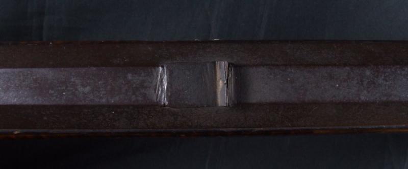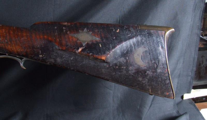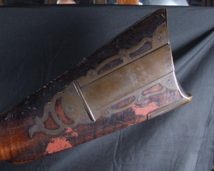 17 Libra Heavy Barrel Flint rifle con M.M. Maslin marcado en la cerradura. A principios de Buffalo Gun. Se reflejan los años de uso prolongado, en piedra original con la culata pesados de ancho, que es una indicación de los primeros fusiles de pedernal. Viene con una tarjeta en patchbox que dice: \ "Esta piedra pesada fusil fue vendido a nosotros por la familia. Ellos originalmente vivían en Bozeman, MT. La familia de quién era el arma fue nombrado Ashland. Gatillo conjunto funcional, con el uso del negro quema de polvo detrás del martillo. En general muy bien. Es muy posible que uno de una pistola tipo, nunca he visto una piedra original de este fusil masiva. Temprana Buffalo Gun.