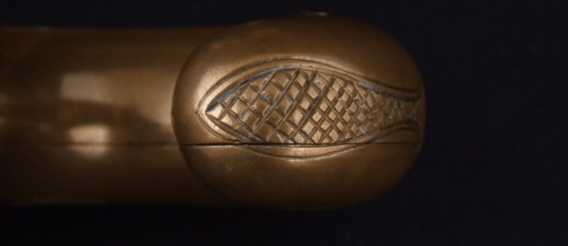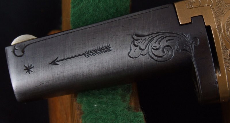 Pair of Matching Moore Single Shot Brass Frame Pistols, both with English Proofs and only 15 nubmers apart. Both in near identical condition. Untouched brass with almost no wear on either. Crisp tight mechanics, rich case color on both hammers. The barrels are very crisp, little used and both appear to have an old English Refinish on them. The barrel address have been helped and in refinishing the patent address on bottom of barrels is now too faint to read. English Proofed and work was probably done long ago in England. A wonderful set of guns that has been together through out their life. Very good as configured overall.