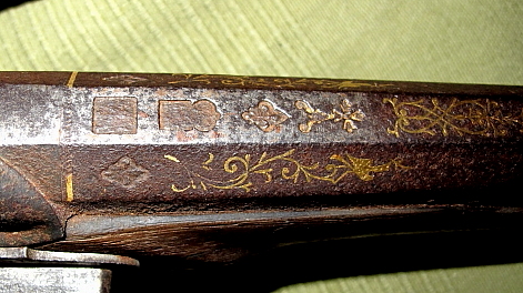 Mi pregunta a los expertos va por la escopeta:a parte de varios punzones y marcas presenta unas caligrafias y adornos dorados. Entre estos signos dorados se lee textualmente, a parte de otros textos o iniciales "de herraduras".