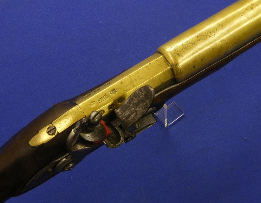 Este es un trabuco para la Marina Holandesa, fabricado en Irlanda en el siglo XVIII, por J. Mills en Limerick, Irlanda. Lleva marcados una P coronada y la marca de la ciudad de Amsterdam ( X X X )