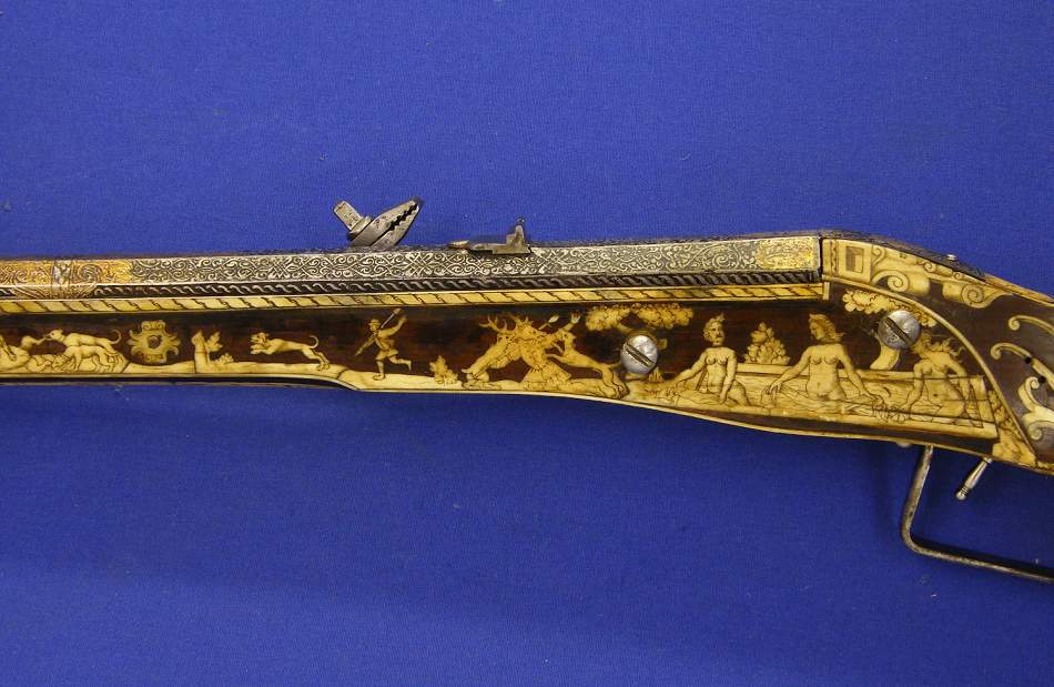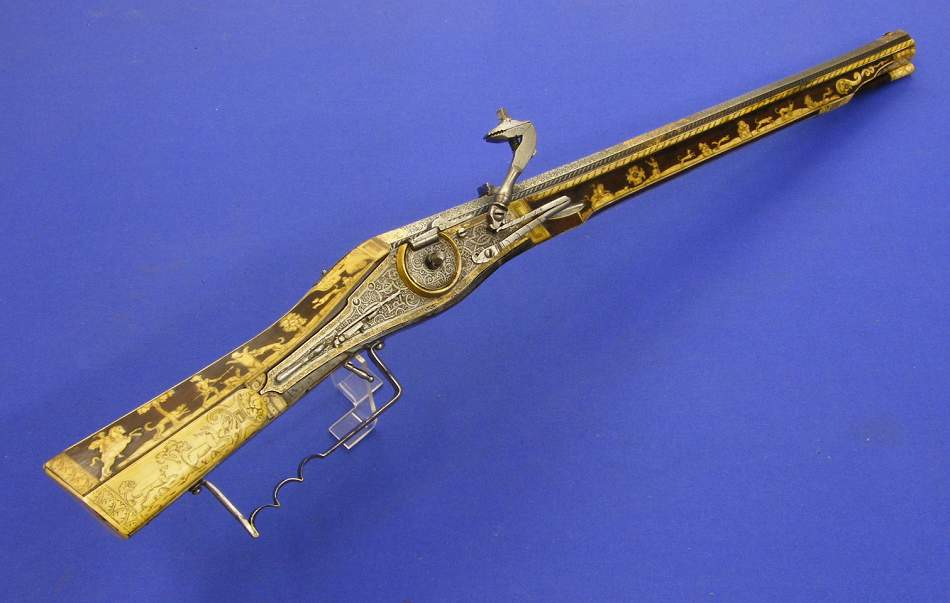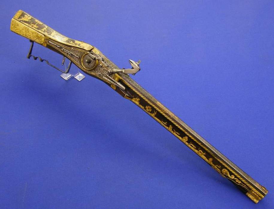 Un rifle aleman de llave de rueda por Johann Ville en Giessen, calibre 15 mm. y 115 cm de largo. Proviene de la Armeria de sus Altezas los Principes de Zalm /Reifferscheidt/Dyck y se vendio en Christie´s London 23 september 1992.