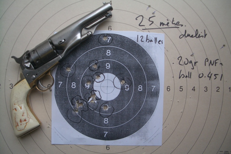 Lo primero decir que soy de Colt,solo de Colt, el coronel hizo un trbajo perfecto. Cuando en el campo de tiro salen a relucir las armas los Colt siempre ganan, a lo mejor no en puntos pero quien no ha oido: es que los Colt...Los mios no son de grandes marcas( Pietta y ASM) por el precio pero son preciosos y con una elegancia sobria inigualable. A parte tengo un pequeñajo de 5.5" del .36 de Pietta que apuntando a los hu... le rompe el corazön, o sea que apuntas al 1 a las 6 y haces 9-10. He de decir que los disparo sin bajar la mano,un revolver no es una pistola,los cargo con polvora y bola,con su propio atacador. Ya se que soy un retrogrado pero estas armas fueron inventadas para eso,¿o no?. La experiencia me ha demostrdo que el 80% de la precision está en la mano, y solo el 20% en todos los demas factores.
