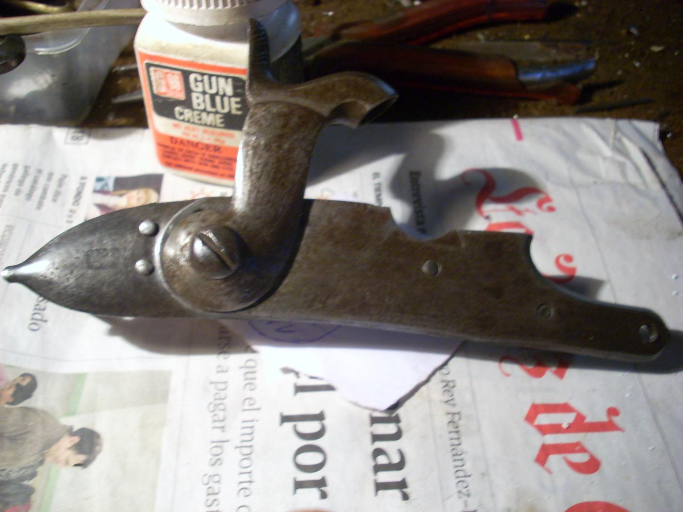 En primer lugar debo decir que seguramente la llave es la original de la caja pero ha sido, como digo limada su plantilla y retemplada, para convertir lo que fue una llave de chispa modelo 1815 en una llave de percusión. Se aprecian perfectamente por la parte trasera los restos de la cazoleta y hasta uno de sus tornillos de sujeción, cazoleta que era de latón por cierto pero que ha sido eliminada, siendo la plantilla en parte limada.