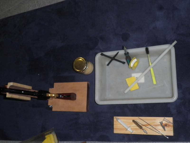 Como puedes ver, en esto se resume el rollo de antes. cubeta donde te quepa el revolver, el soporte de madera, grata, llave multiple para quitar las chimeneas, teflon para despues colocar en la rosca de las chimeneas, baqueta de nylon con su lavador hecho a base de lima, dosis de plastico par la carga de polvora, jeringa con vaselina para sellar las chimeneas, cepillo de dientes, unas pinzas para dejar caer el proyectil en el tambor, destornillador,...