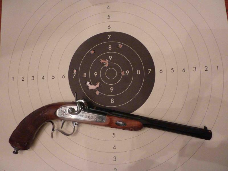 El sabadito por la mañana tire con mi Galand, un caprichito que me di. Tengo una Hunderhamer de Ardesa que es con la que mas tiro y me casco puntuaciones decentes. Resulta que la que compre tenía el punto limado y dos alzas pero ninguna regulable, su anterior propietario la puso fija. Después de ponerle un punto nuevo y reparar el alza para que sea regulable realice unas pruebas, al principio tiro muy bajo (demasiado) Subí el alza considerablemente pero el tiro se quedo en el 8 a las 9, lime el punto y lo rectifique. Entro en el 9, lime otro pelín y tres impactos uno encima del otro en el mismo centro, después tres tiros mas en el 10 a las 3 tocando el 9. Después de esto decidí irme antes de estropear la tirada, me sorprendió como se pisaron los tiros. Solo en una ocasión realice algo parecido, cierto es que estas armas tiran muy bien después de una pequeña puesta a punto. Esta según dice en la pag pesa unos gramos mas que la mia, creo que puede ser por la empuñadura.
