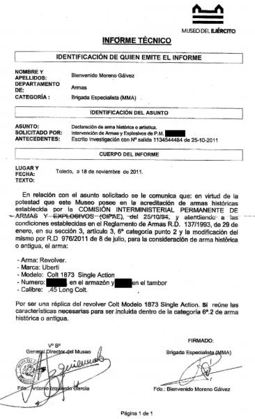 ARMONICA escribió:Compañero, el arma primero hay que catlogarla en la categoria 6.2 y en eso el unico que tiene potestad es el museo del ejercito el cual se pronuncia en la catalogacion de arma historica,antigua o artistica con lo cual te emite un informe tecnico el cual recibes y presentas en tu intervencion y este informe tecnico viene firmado por el brigada especialista y coronel director del museo, ...