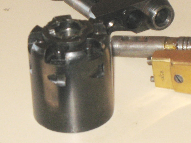 La arandela está perfectamente ajustada por el exterior a la corona de dientes del tambor y este gira con gran suavidad en su interior, no está fijada ni adherida al chasis del revolver y actúa como base de reparto de la presión que el disparo le produce al tambor sobre el armazón de latón, de modo que al ampliar la base de apoyo la presión sobre el latón disminuye en la misma proporción que aumenta la superficie de apoyo, yo calculo que reduce la presión sobre el laton en más del 70%. Creo que no se va a deformar más ese latón (todo sea que el acero de la arandela casque, espero que no)