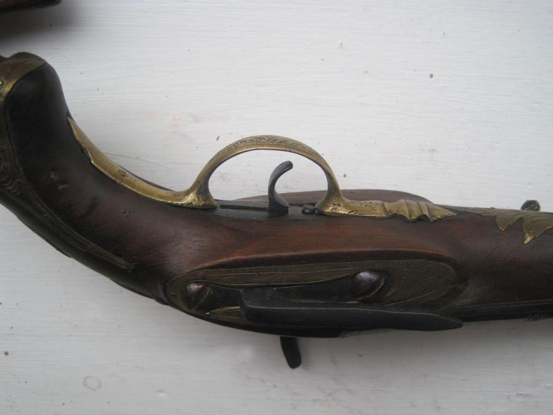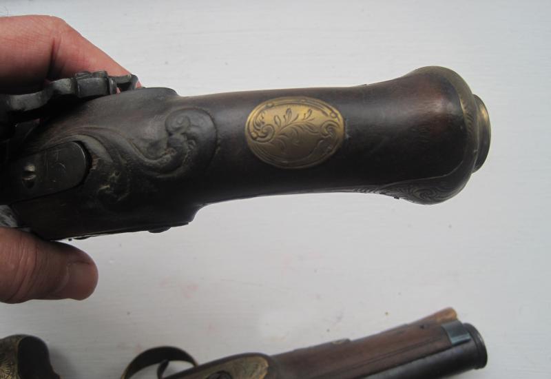 Adjunto dos imágenes de pistolas similares, pero en su versión de pedernal. Fijaros que el contorno de la platina de ambas es casi idéntico al de la que nos ocupa:
