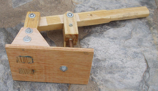 Hola a todos, como ya os comenté he colocado para reforzar el pié de la palanca, dos piezas trapezoidales reforzadas con tornillos y listones triangulares de balsa. El eje del tambor es un tornillo de 5 mm y un tubo de latón de 5 mm interior y 6 mm exterior. La base he tenido que suplementarla para que quede plana.