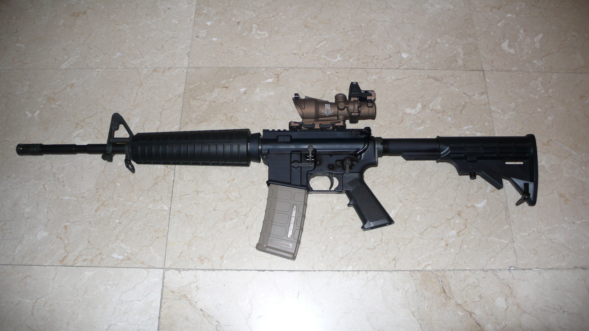 Aqui os subo el nuevo complemento que le he puesto a mi SABRE AR-15, un TRIJICON ACOG TA31ECOS, con un 4x32 y punto rojo encima, una pasada.