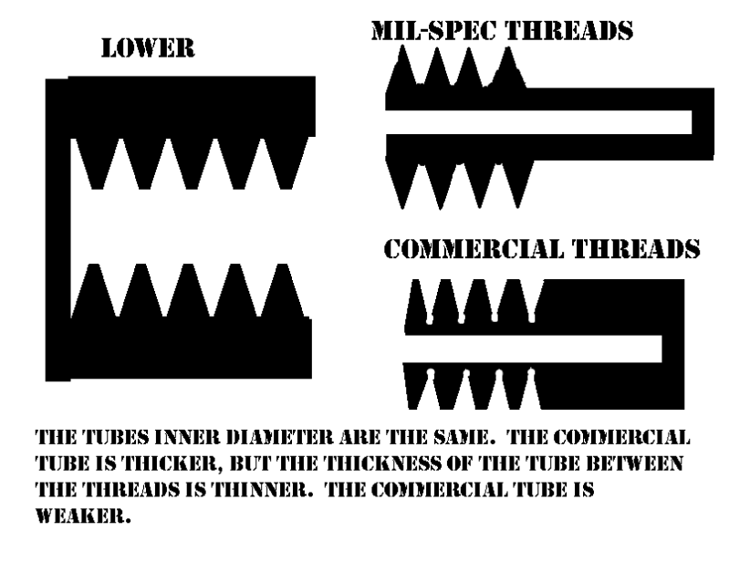 Lo que si que cambia es la forma de las roscas del Mil-Spec, que siendo el mismo paso, tiene roscas mucho más puntiagudas para que tengan más contacto con el Lower y se agarre mejor.
