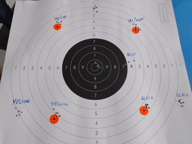Cuando hemos llegado a la galga azul, el cerrojo ya iba durito y se ha resentido la agrupación como se puede ver en el centro y a la derecha del 7. La galga negra ha sido la que se ha quedado puesta.