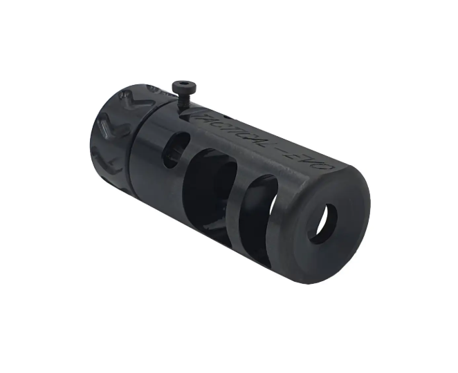 No sé por qué y cómo, pero este dispositivo de hocico se conoce más a menudo como “freno inclinado”. En realidad, no es un freno de hocico, no mitiga el retroceso. Es un compensador de elevación de hocico. Los gases que salen de la boca se desvían de la superficie inferior sobresaliente empujando la boca hacia abajo y hacia la izquierda, contrarrestando así la tendencia de la boca a subir y girar a la derecha al disparar."