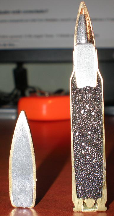 Para salir de dudas: fotos de una bala del 7.62x51 posterior al año 1993 seccionada y de un cartucho de Santa Barbara del 5.56x45 de los años 90. La bala del 7.62 es la que se monta en la actualidad en Palencia.